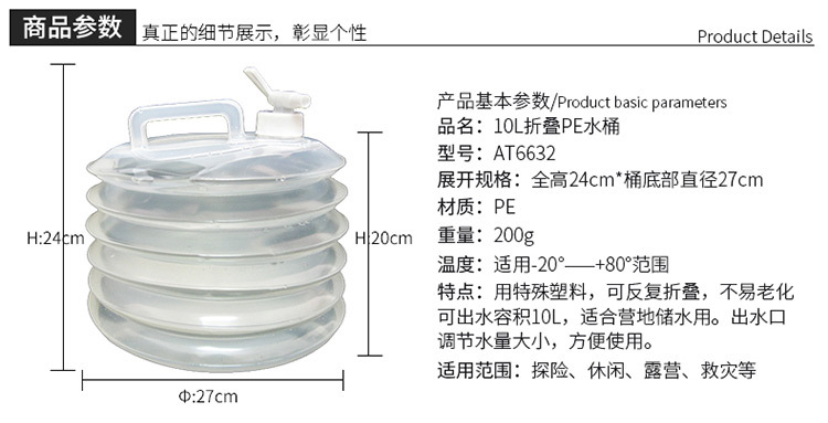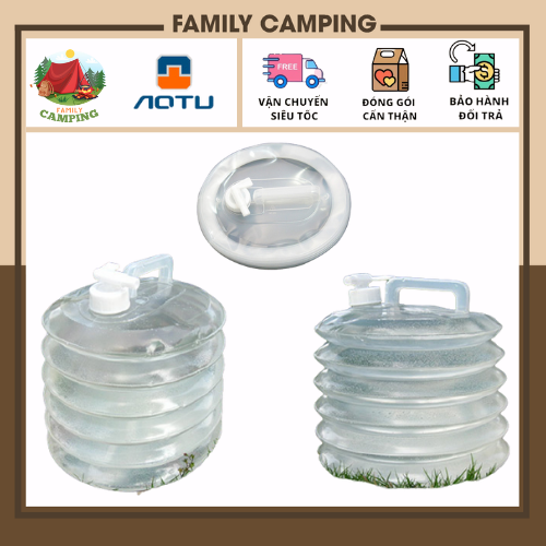 - Tính năng: Được làm bằng nhựa đặc biệt, có thể gấp lại nhiều lần, không dễ bị lão hóa và có thể tích nước đầu ra là 10L, thích hợp để đựng nước cắm trại. Cửa xả nước điều chỉnh lượng nước, tiện lợi khi sử dụng.