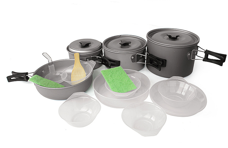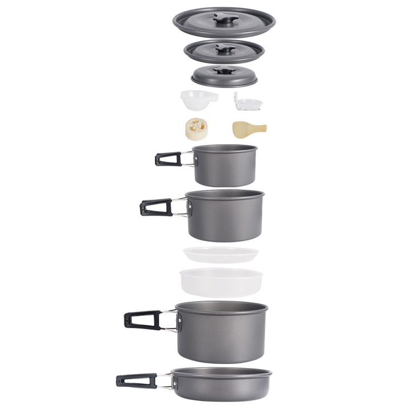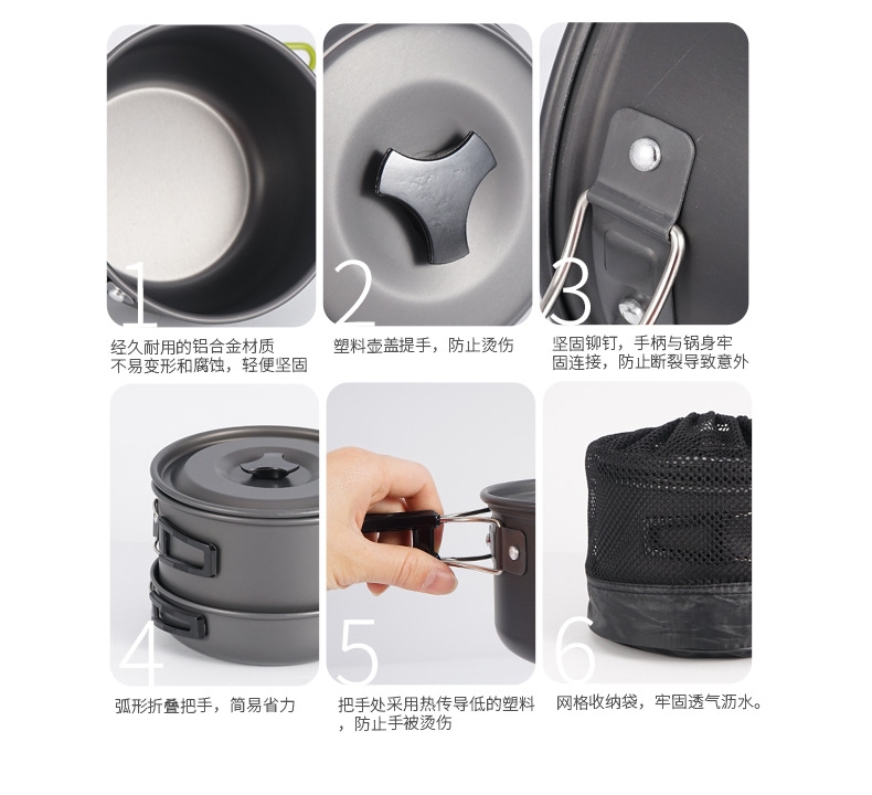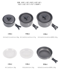 Thích hợp cho 5 ~ 6 người, bao gồm nồi lớn, nồi vừa, nồi nhỏ và chảo rán, 1 thìa súp, 1 thìa ăn cơm, 5 bát và 2 đĩa. Được làm bằng nhôm, oxit nhôm cứng, chịu được nhiệt độ và ma sát cao. Thìa được làm bằng chất liệu nhựa PP, thìa, thìa ăn cơm và bát nhựa được làm từ chất liệu có độ cứng cao. Đóng gói trong túi lưới màu đen và hộp màu.