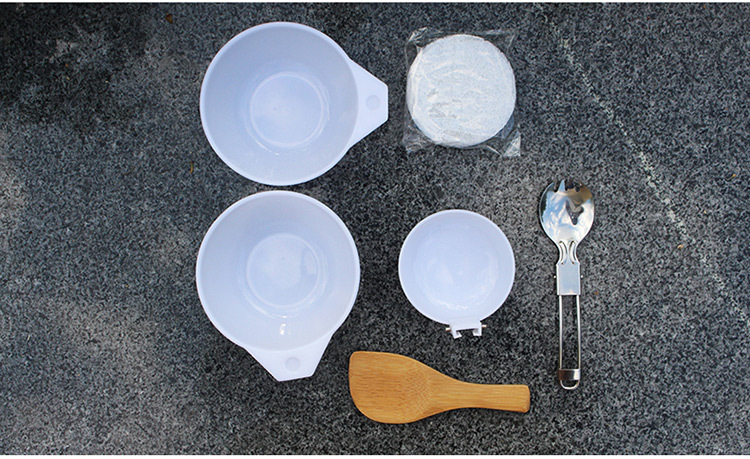 Muỗng súp: 1 Muỗng cơm tre: 1, Viên rửa chén 1, Muỗng thép không gỉ 1