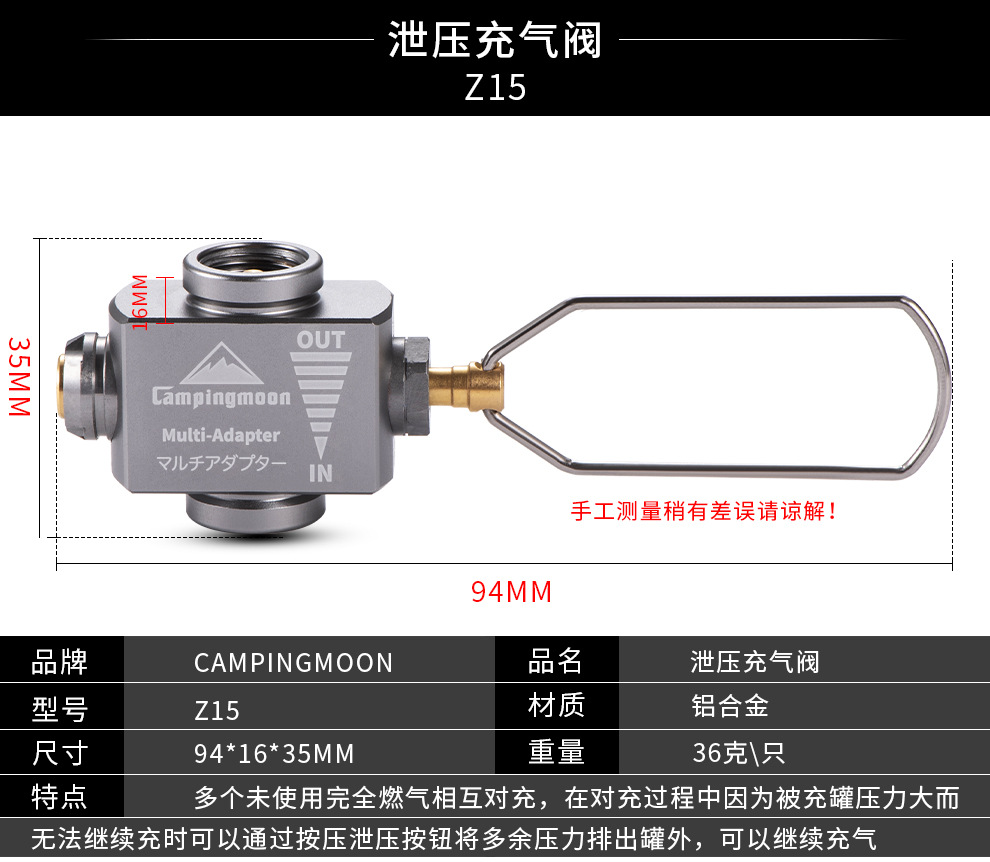 Đầu Adapter sang chiết bình gas Campingmoon Z15 được sử dụng trong trường hợp cần sang chiết gas từ bình chuyên dụng loại to sang bình chuyên dụng loại nhỏ hoặc bình ga du lịch mini sang bình ga chuyên dụng ( kết hợp dùng đầu chuyển Z10)