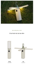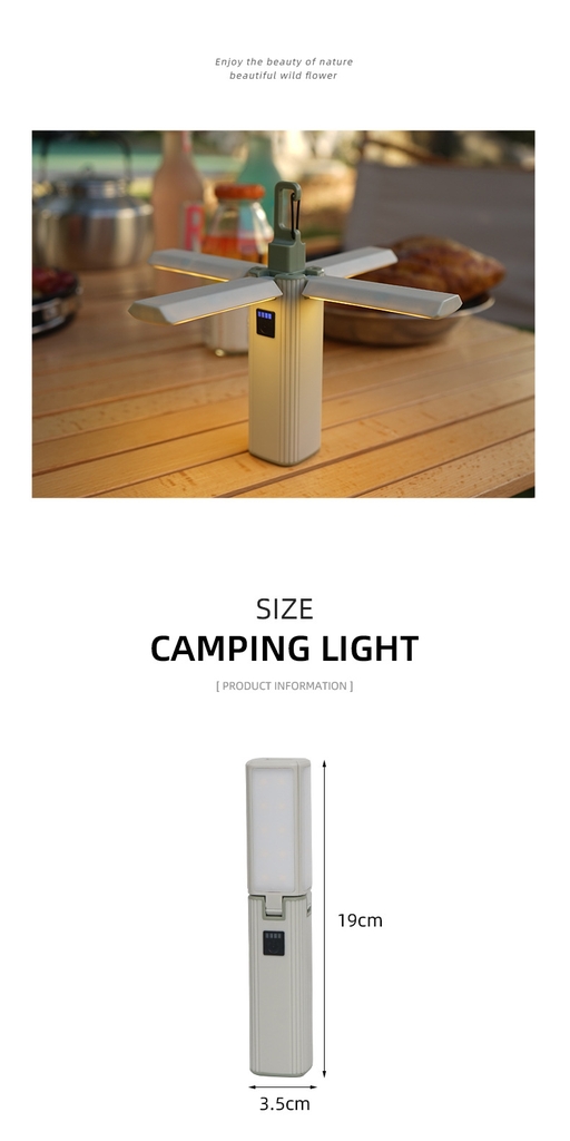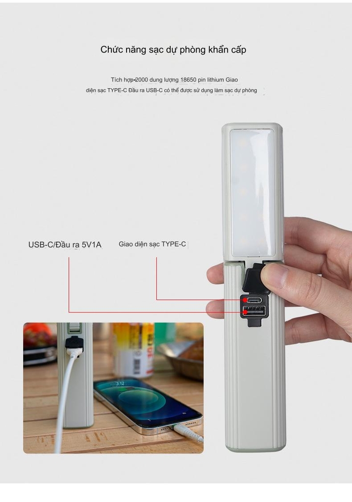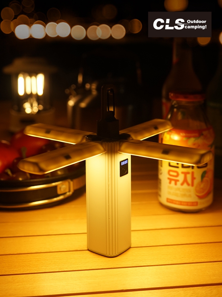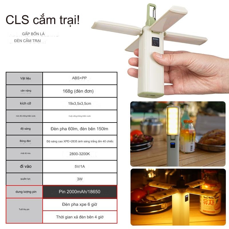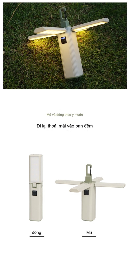 Đèn Led nhỏ gọn nhiều chức năng, vừa có chế độ đèn pin, vừa có chế độ bật sáng 360 độ toàn cảnh. 4 cánh lá đèn led chứa 40 bóng led 2835 có thể gập lên xuống 90 độ giúp chiếu sáng mọi góc độ cần thiết. Pin lithium 18650 dung lượng 2000mah giúp thời gian phát sáng lên 6h. Pin sạc nhanh qua cổng type C đầu vào, trong trường hợp cấp bách có thể dùng thay sạc dự phòng bằng đầu ra USB-C. Đèn thiết kế chống nước theo tiêu chuẩn IPX4, có thể dùng ngoài trời. Ánh sáng có 3 chế độ: đèn pin spot, sáng mạnh, sáng nhẹ, cùng độ sáng từ 60lm đến 150lm. Nhiệt độ màu vàng ấm 2800-3200k. Có móc treo chắc chắn giúp móc được ở nhiều nơi. Trọng lượng siêu nhẹ có thể gấp gọn dễ dàng đút túi áo quần mang đi.