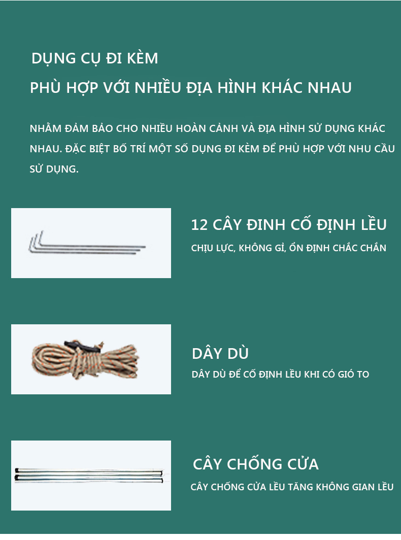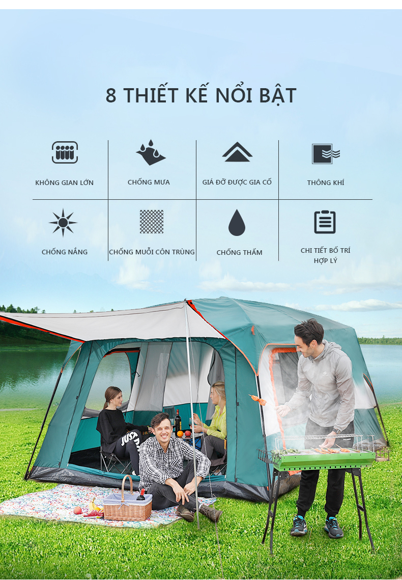 - Kích Thước bung lều: 310 x 210 x 185 cm (4-6 người) và 420 x 305 x 210 cm (8-12 người)