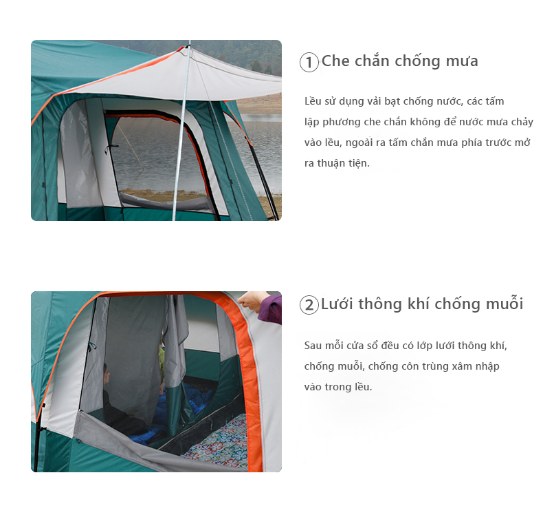 - Với chất liệu vải chống nước 2 lớp cực tốt, lều sẽ giúp bạn không bị ướt bởi các cơn mưa