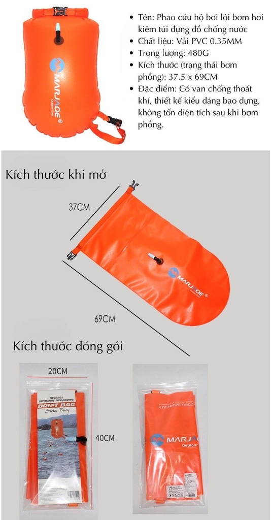 - Phao chống thấm nước tuyệt đối, chất liệu nhựa poly, cấu tạo 01 ngăn để đồ, 01 ngăn bơm hơi (có van 1 chiều được điều chỉnh tháo hơi bằng núm vặn) cho phép đựng đồ cá nhân khá thoải mái và khi có nhu cầu sử dụng như phao bơi thì có thể dễ dàng thổi phồng để sử dụng.